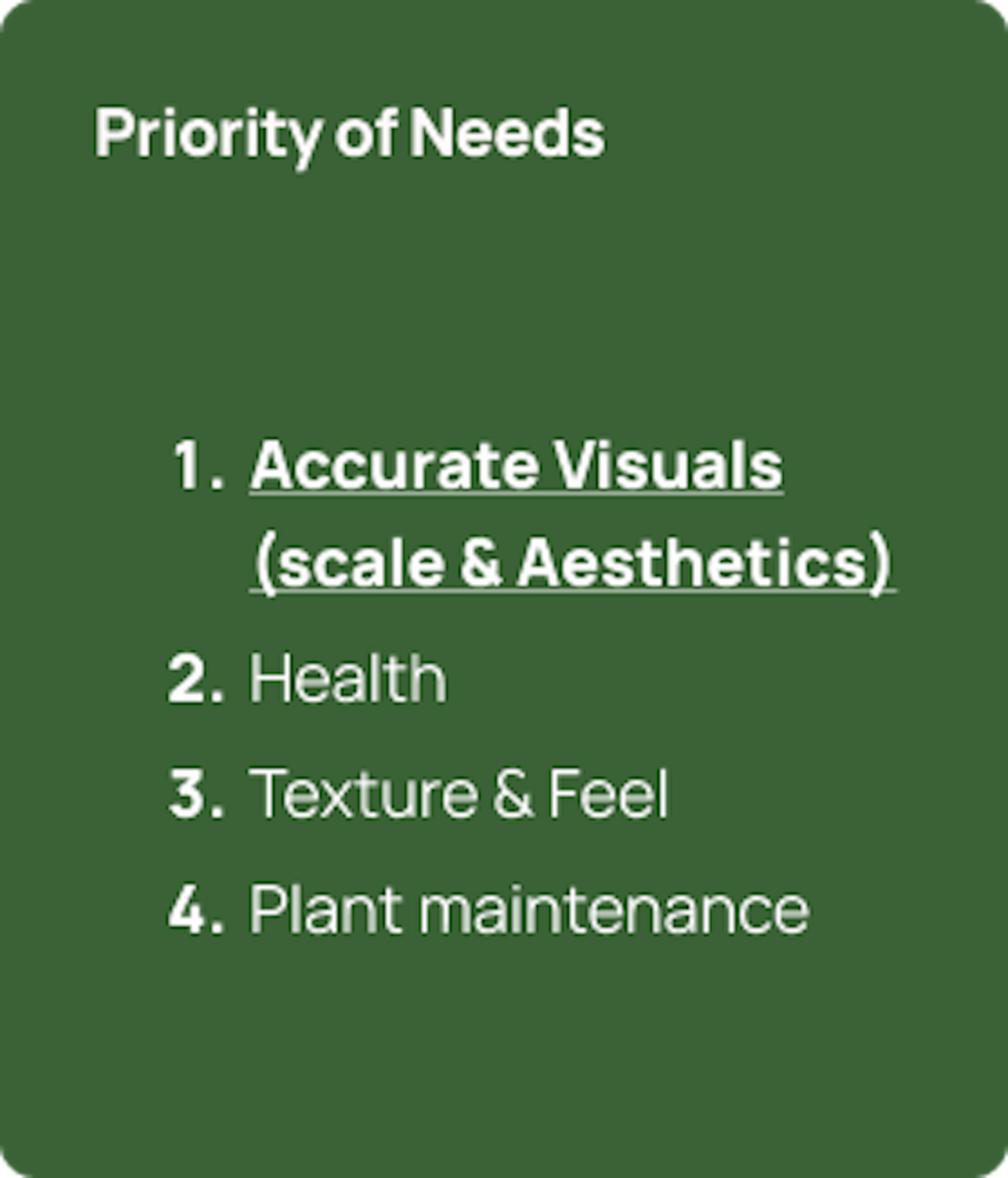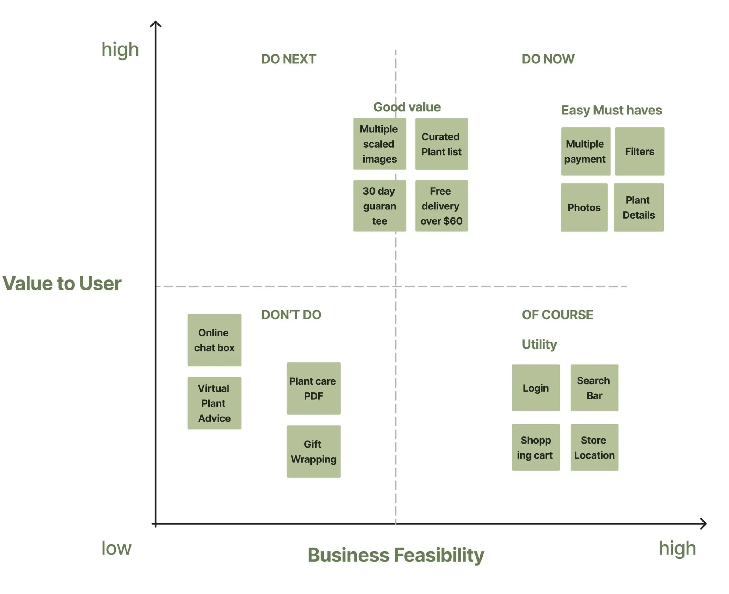 Scaled plant images feature: This idea was feasible but not that impactful. Our research identified other competitors were already doing this to varying success. We assessed this could be an easy-to-implement additional feature that would enhance the shopping exp.