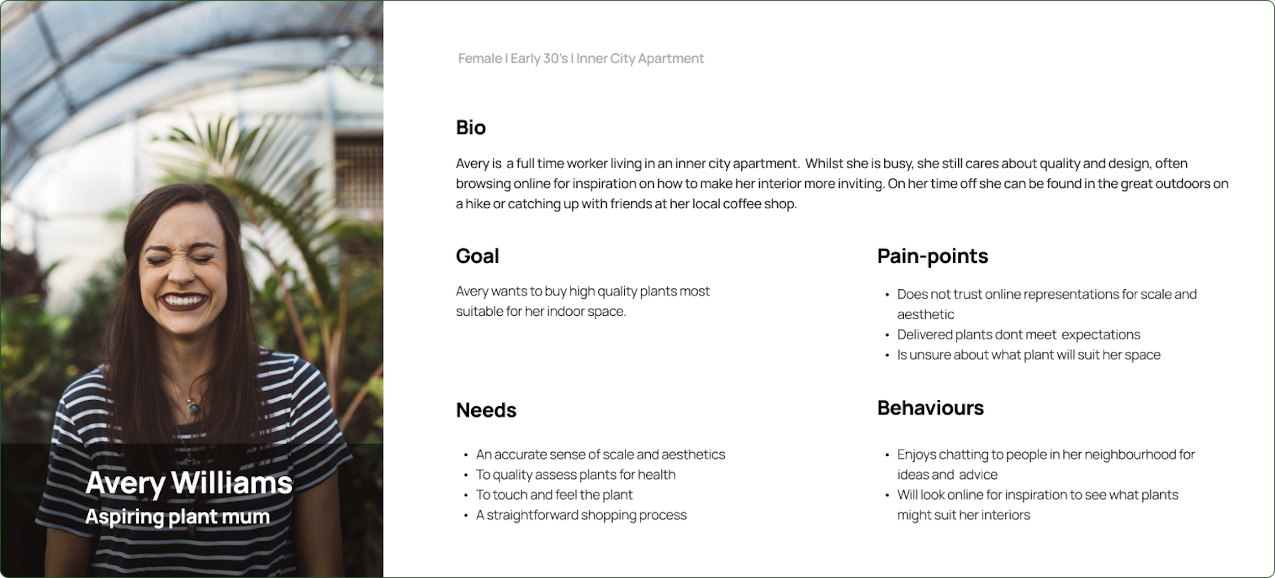 As an aspiring plant mum, Avery is looking for quality plants to suit her inner city apartment. She browses her local nursery website for inspiration but is hesitant to purchase online as she is unable to accurately visualise or quality assess the plant. She resorts to going in store for advice and for assurance.