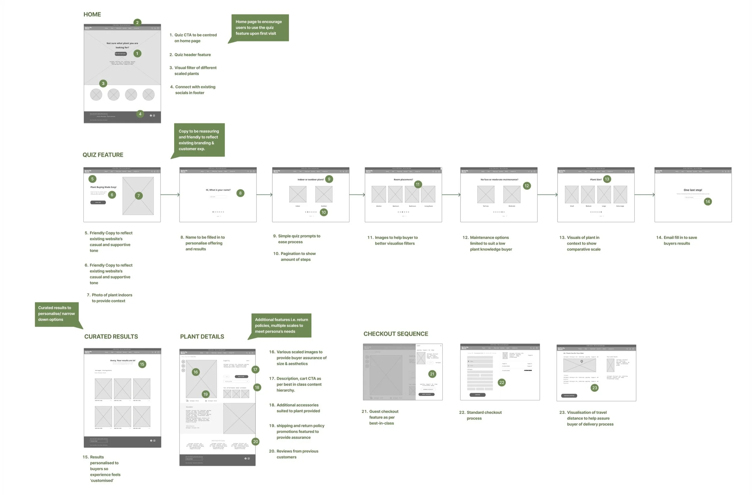 The solution is a friendly and playful e-commerce interface with a quiz feature. The visual prompts and curated list of plant suggestions simplifies the shopping experience whilst providing guidance and reassurance to new plant buyers.