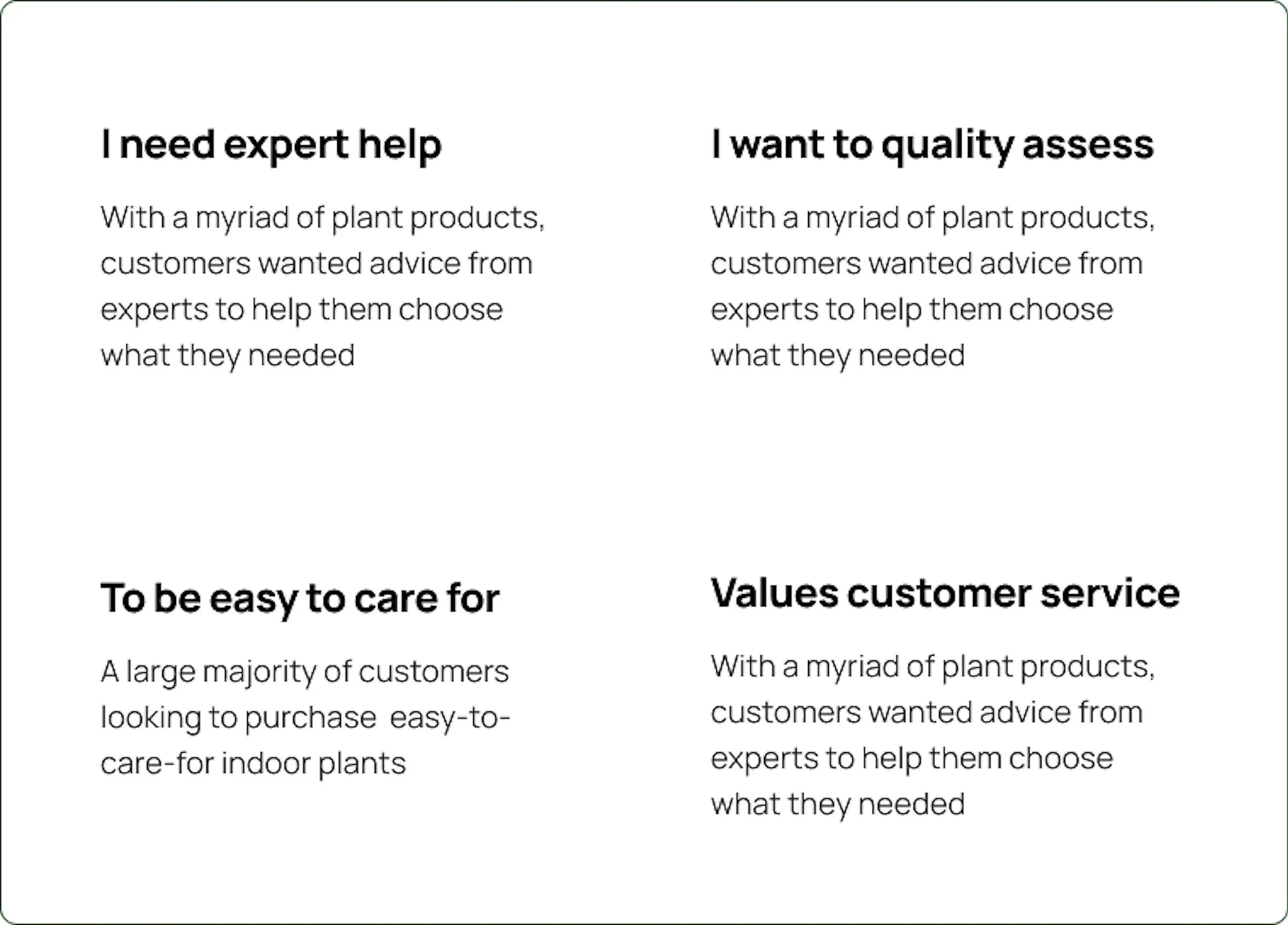We synthesised these findings through affinity mapping, analysing and categorising insights with the goal of identifying the main needs, wants & frustrations plant buyers experienced.